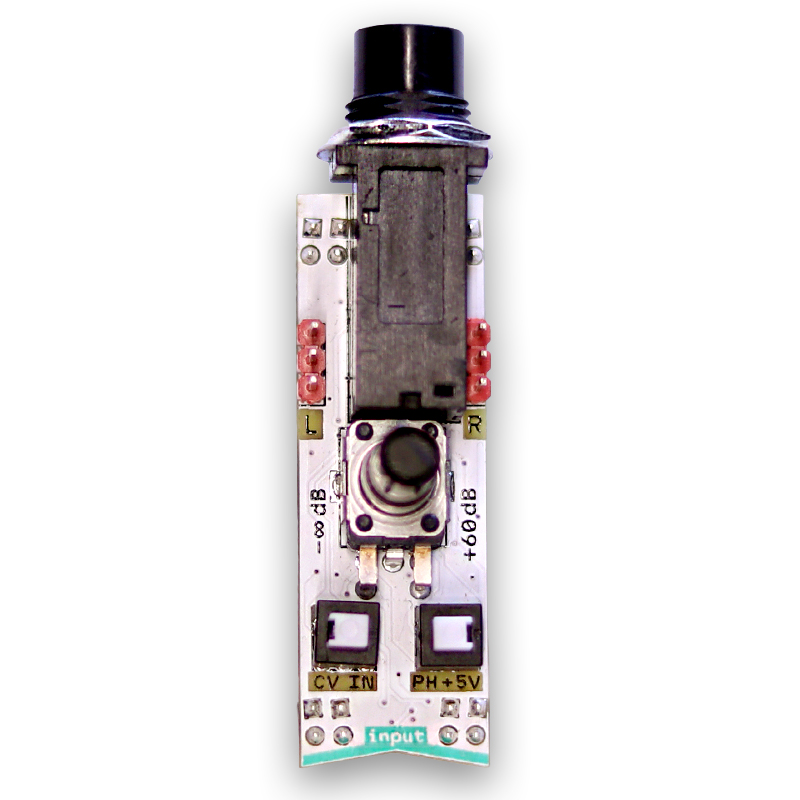 line/mic/cv input module for connecting any external sources. has +5V phantom power for microphones, adjustable gain up to 60 dB and optional DC blocking for CV signals