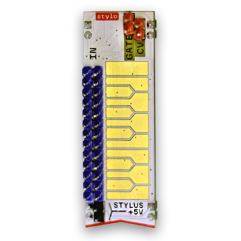 1-octave stylus keyboard with gate outputs and CV with 1V per octave. aliator-clip wire coms with the module as a stylus